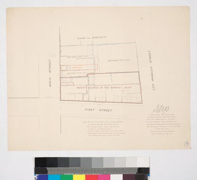 ...allotted to Caroline and Alice Shafer, northeast from Alameda and Aliso St., showing structures, Ramirez Vineyard, lot owners; courses, distances; colored ink & pencil. Paper watermark: Royal Linen Ledger. Alt title supplied by cataloger.
