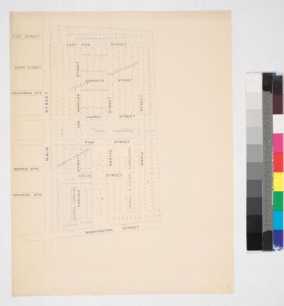 Along Santee St. and Maple Ave. from Washington to Pine St.; sketch copied from LA County records; courses, distances, parcel numbers; also indicates Brodrick & Consuelo subdivisions. Paper watermark: Royal Linen Ledger. [see also Maps 406, 473, 476, 565, 647, 651, 700]. Alt title supplied by cataloger.