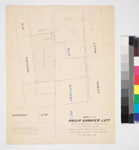 Alameda to Los Angeles St., south from Ferguson Alley, showing lot owners; color highlighting, courses, distances; hachures. Paper watermark: Royal Linen Ledger. Alt title supplied by cataloger.