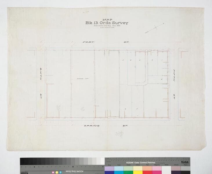 Fourth St., Fort to Spring St., showing structures, frontages, lot owners; colored ink, hachures, courses, distances. Paper watermark: Southworth’s 1882 Linen Bank. . Alt title supplied by cataloger.