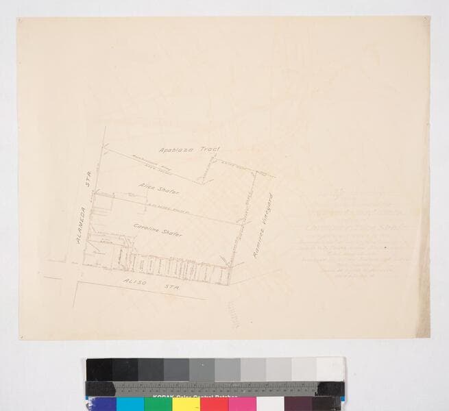 Partition of a part of the Matthew Keller Estate allotted to Caroline and Alice Shafer [northeast from Alameda and Aliso St., showing structures and names of lot owners]