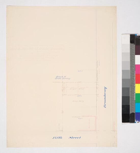 Sixth St. and Grand Ave., showing structures, color highlighting, courses, distances; surveyed at the request of Stephens, Guirado & Harvey. . Alt. title supplied by cataloger.