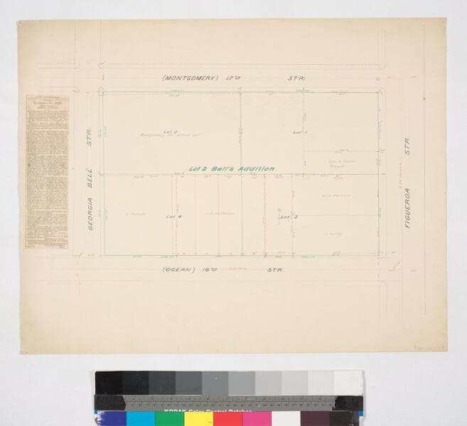 Eighteenth (Ocean) St. from Figueroa to Georgia Bell St.. Copy of Map Book 3 p. 6 City Engineer's Office, shows lot owners, bearings, distances; color highlighting; pencil calculations. Title supplied by cataloger.