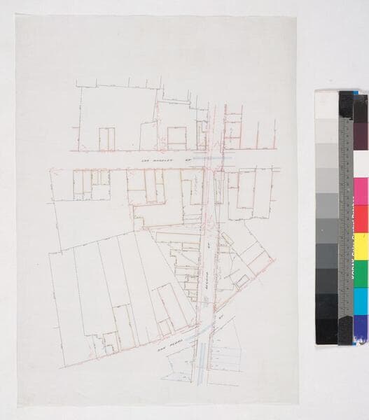 From Los Angeles to San Pedro St., showing structures, lot owners, courses, distances; color highlighting. Paper watermark: Royal Linen Ledger. [See also Maps 635, 729, 736]. Alt title supplied by cataloger.