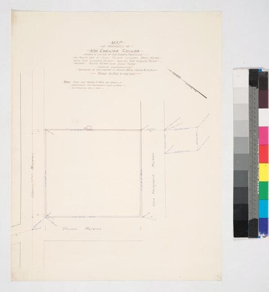 Showing improvements; structures, color highlighting, courses, distances. Eleventh to Twelfth St. from Hill to Main St., Verso: "Mrs. Childs". Paper watermark: Royal Linen Ledger. Alt title supplied by cataloger.