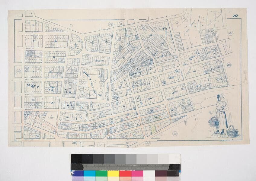 Showing structures and lot owners, with title history (1853-1886). Color highlighting, courses, distances. Title supplied by cataloger.