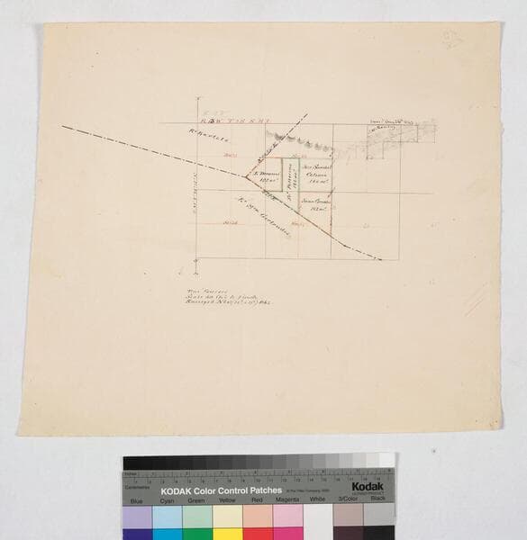Parcels on east side of Alameda St. south from Scott's Vineyard, with field notes, color highlighting, distances, bearings, acreage. Title supplied by cataloger.