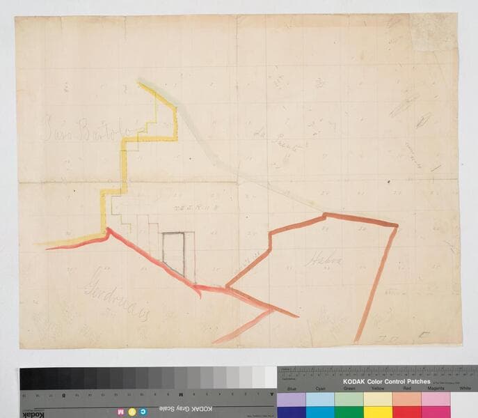 Rancho Paso de Bartolo. On township grid: hachures, color highlighted parcels of Childs, Hellman, Wiseman, Qualey, and Passons; pencil annotations. Title supplied by cataloger.