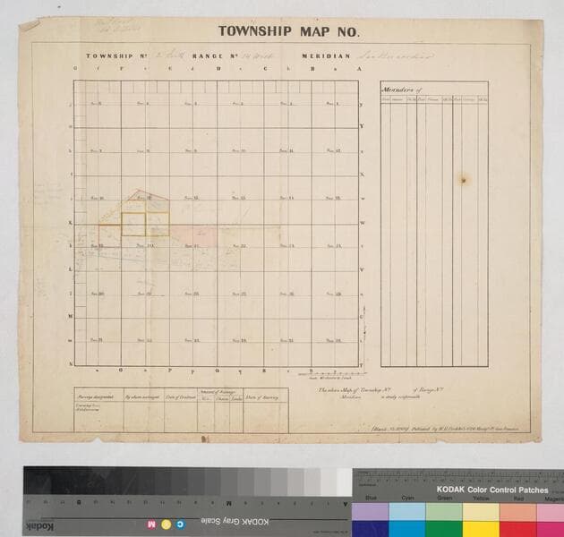 Bordered by Ranchos Aguaje de Centinela, La Cienega, La Ballona, Sausal Redondo. On printed township grid: Sec. 11, 17-21, T.2 S.R. 14 W. S.B.M., with inset of boundaries in sec. 19; partly based on surveys of Aug. 28, 1874 & Jan. 23, 1883; with notations, calculations. Title supplied by cataloger.