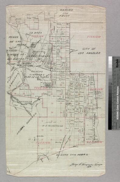 Boundaries with Ranchos Aguaje de la Centinela, Sausal Redondo, la Ballona, and Ciénega ó Paso de la Tijera*. On printed Township Map grid with Meanders and survey data tables; notation re: railroad add sections; shows parcel owners; color highlighting. Title supplied by cataloger.