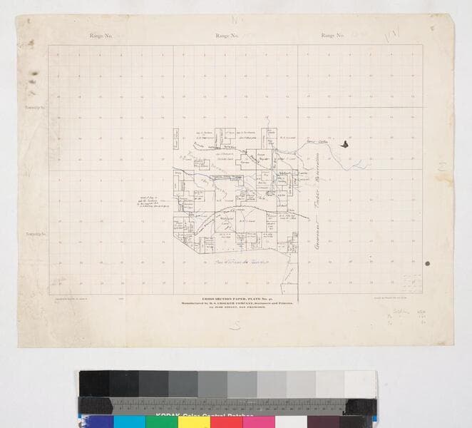 On printed township grid showing structures, surface detail, notes re: parcel owners & corresponding courses. Paper watermark: Hurlbut Paper Co. Title supplied by cataloger.