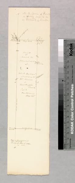 Enlarged draft of portions of first map in folder; less complete than previous map: distances, but no lot numbers, parcel owners. Pencil calculations on front & back. Title supplied by cataloger.