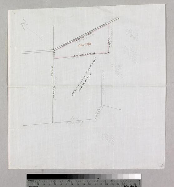 Belonging to the heirs of Ramona S. de Machado deceased; Compton & Santa Monica Road; showing courses, acreage, distances, markers, parcel owners Jose de la Luz Machado, Dolores Machado