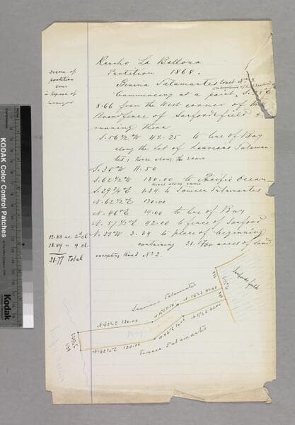 On front page of document, "Rancho La Ballona Partition 1868, Manuel Valenzuela, commencing at a point..." Color highlighting, showing courses, distances. Title supplied by cataloger.
