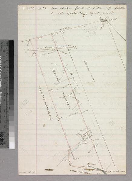 On sixth page of "1868 Ro. La Ballona Macedonio Aguilar as successor of Benina Talamantes... 3rd class land north of Ballona Road No. 2" with color highlighting, courses, distances, parcel owners, county road, Valdez structure; calculations. Title supplied by cataloger.