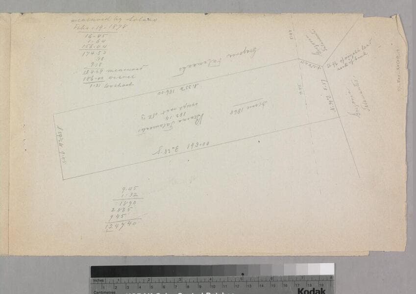 On page 3 of document, "1868 Rancho La Ballona Manuel Valenzuela, Lauriano Talamantes, Macedonio Aguilar as successors to Benina Talamantes, 3rd class land... sold to Albert Eldred..." Shows courses, distances, parcel owners, stations. Title supplied by cataloger.