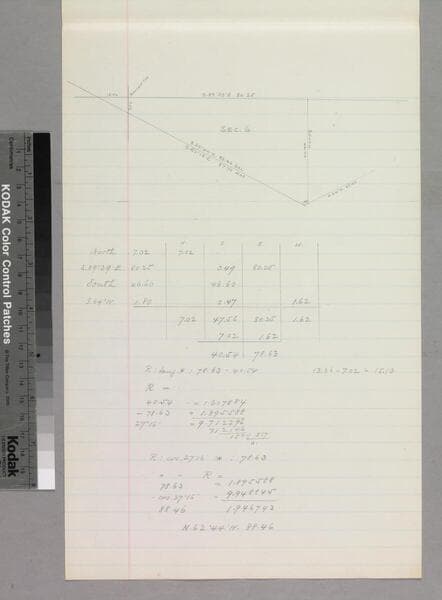 Shows courses, distances; survey notes; followed by page with sketches on both sides, calculations, survey notes; followed by two copies of stapled Field Notes which contains numerous sketches. Title supplied by cataloger.