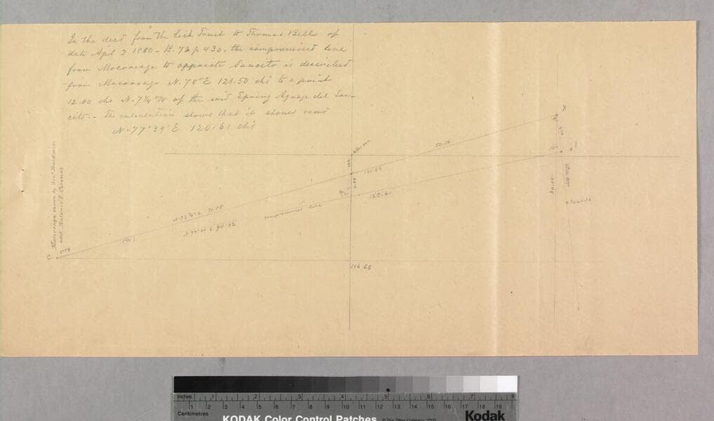 3 sketch maps re: Spencer Wilson tract with sketch of T.1 N.R. 13 W.; abstract of tract of Spencer Wilson showing tracts of Soledad & Anastacio; sketches referencing boundary with Rancho Providencia, from Station 20; 2 sketches references survey made by Capt. Moore at the request of Griffith showing base line; sketch - part of Bell filed June 16, 1880, bordered by James Lick parcel to the south. Title supplied by cataloger.