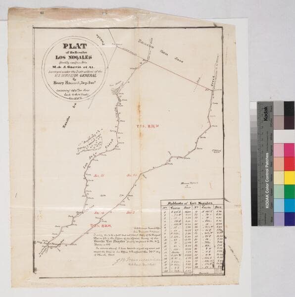 Bordered by Ranchos De Azusa, San Jose, Los Nogales, Rincon de la Brea, Cajon de San Juan, La Habra, San Bartolo, Potrero de Filipi Lugo, San Franciquito and public lands. Showing townships, section numbers, markers, surface details - hachures, San Jose Creek, La Puente Hills; color highlighting, certification; table of boundary data. Title supplied by cataloger.