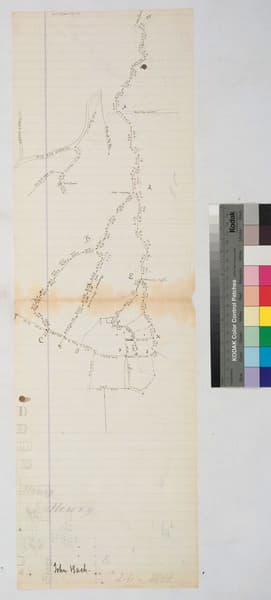 Blue & black ink, showing courses & distances, tributaries, sections E & K, with table of courses & distances. Title supplied by cataloger.