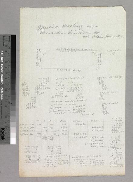 Showing courses, distances (some tabled), many calculations; also Dallas M. Cate, Guirado, White, Fuller parcels; fence of Dallas Cate. Title supplied by cataloger.