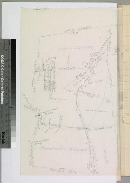 Cut out corner of larger [missing] map, showing courses, distances; parcels belonging to Prager, Cohn & Cahen, Bordrick & Jesurun . Title supplied by cataloger.