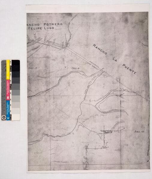 Bordered by Ranchos San Antonio, La Merced, Potrero de Felipe Lugo, La Puente. Hachures, color highlighting, structures, parcel owners; proposed subdivision; notes re: lands of Charles Prager occupied by other parties; shows Rio Hondo, San Gabriel rivers and San Jose creek.