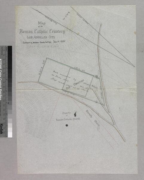 At end of Eternity St., dense hachures, color highlights; road to the Arroyo Seco shown; seal placement indicated; certified by Mayor John G. Nichols (1852-1853; 1856-1858); surveyed requested by Rev. B. Raho. Alt title supplied by cataloger.