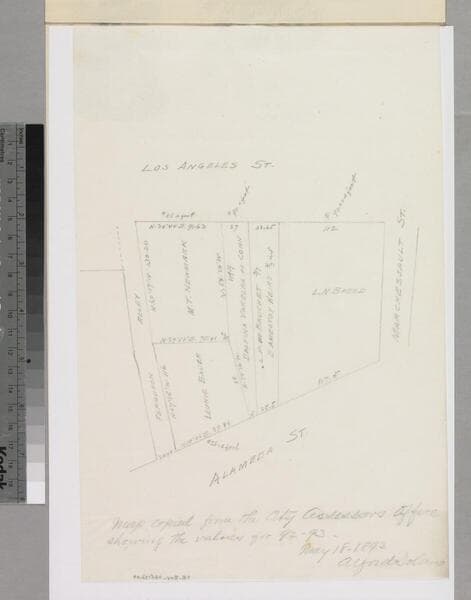 P. 5 of "Amestoy-Bauchet, No. 19.167 Superior Court..." document, showing lots between Ferguson Alley & Los Angeles Street with acreage, courses, distances, parcel owners; map copied from the Assessor's office map. Title supplied by cataloger.