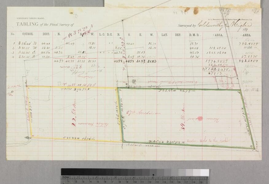 P. 3 of stapled document, "Engel tract in the Rancho Santa Anita..." showing courses, distances, acreage, parcel owners, Lamanda Park, county roads ; color highlights. Title supplied by cataloger.