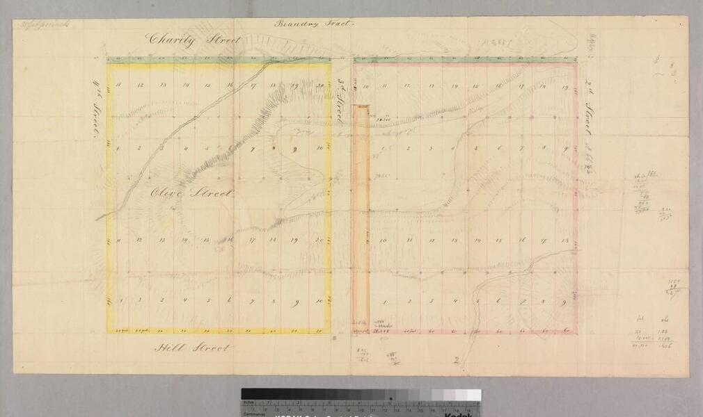 Subdivided into numbered building lots - Hill to Charity St., Second to Fourth St.. Survey notes and title history (1855-1867); Extensive surface detail; color highlighting. Alt title supplied by cataloger.