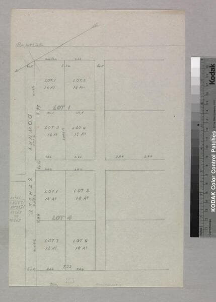 Showing lot numbers, courses, distances, from Figueroa & Georgia Sts. south, Downey to Washington St., parcel owners, structure. Alt title supplied by cataloger.