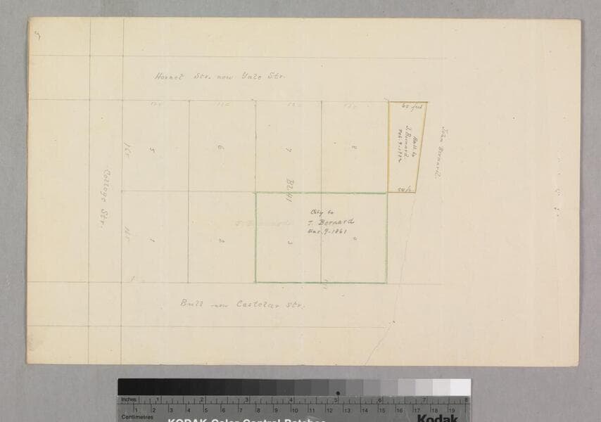 Castelar to Buena Vista St., Bellevue Ave. (Short St.) to Sand St., showing structures, lot owners, with notes; courses, distances, survey history. Paper watermark: Southworth’s 1882 Linen Bank. Alt title supplied by cataloger.