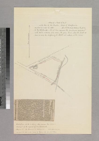 Within folder, "Lot on Main Street," pg. 5 [marked p. no. 6] of document, "Los Angeles City April 24, 1871, The R.R. Bishop Amat requests..." showing church lot with courses, distances, structures, posts; outlined in color . Alt. title supplied by cataloger.