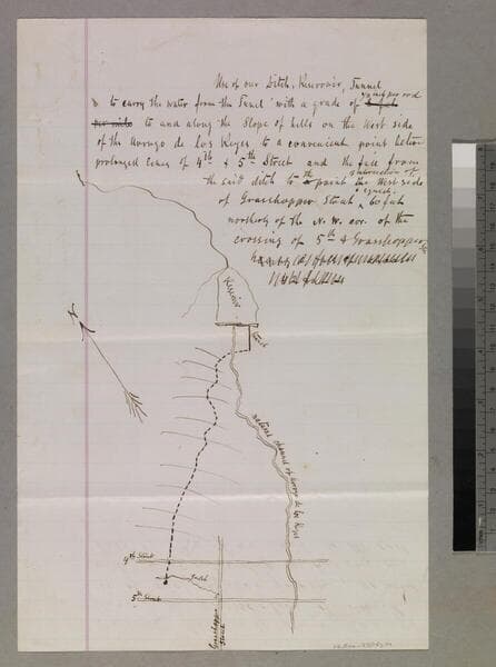 Los Angeles River at top; Spencer Wilson, Anastacio Feliz properties on right side [East] and Cyrus Lyon's bottom middle at the end of "canal reservoir co. ditch". Hachures, blue colored pencil. Back of map has calculations and sketched intersecting circles. Title supplied by cataloger.