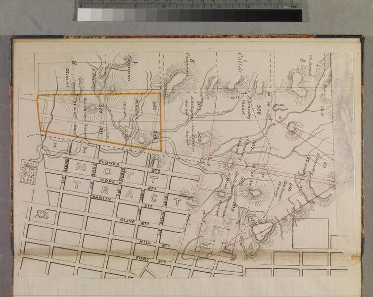 Pgs. 81-83 of bound volume, "Subdivision of Lots 500, 501, 502 and 503 of Canal and Reservoir Lands," showing hachures, markers; 1st Street, Mott Tract, Flower Street. Title supplied by cataloger.