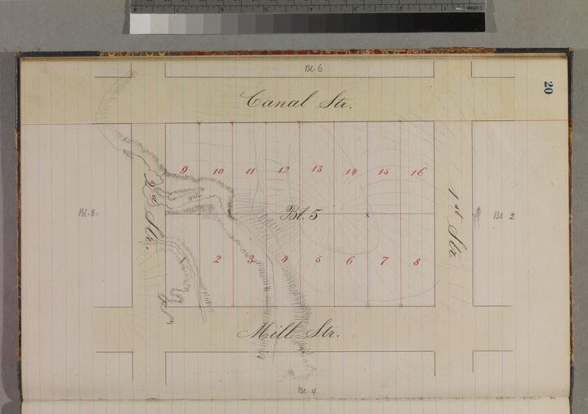 Pgs. 4-68 [not consecutive pages] of bound volume, "Subdivision of Lots 500, 501, 502 and 503 of Canal and Reservoir Lands," maps of varying sizes, showing block & lot numbers, penciled details, hachures, parcel owners, field notes; Block 13 having the most detail & note activity [bordered by Mill, 4th, Pearl & 5th streets]. Alt title supplied by cataloger.