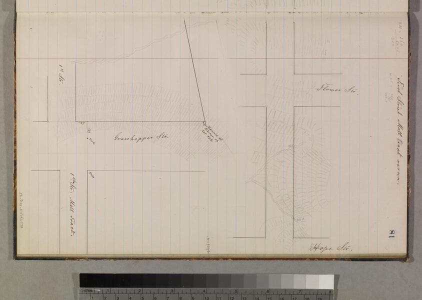 Pgs. 81-83 of bound volume, "Subdivision of Lots 500, 501, 502 and 503 of Canal and Reservoir Lands," showing hachures, markers; 1st Street, Mott Tract, Flower Street. Title supplied by cataloger.