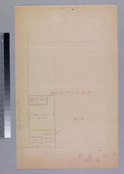 Bound within document, "Rancho San Pedro, 1000 acres subsidy..." Color highlighting; showing townships,section numbers, acreage, distances, parcel owners. Title supplied by cataloger.