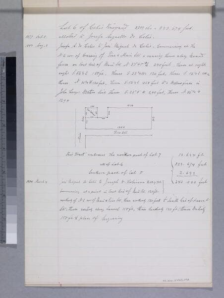 P. 11 of stapled document, "The Celis Vineyard Tract..." showing courses, distances of numbered lots (1-14) marked "discarded" at intersection of Main & Washington Sts. Reduced copy by Hansen of a sketch map by Miguel de Celis.. Alt. title supplied by cataloger.