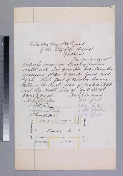 P. 2 of document, "Cemetery Avenue," showing distances, parcel owners, Sand & Temple Sts.; color highlighting. Title supplied by cataloger.
