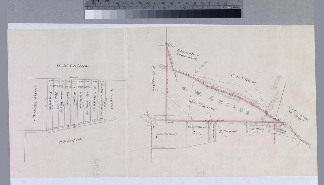 Pgs. 6 of document, "Child's Tract, being a part of the Rancho San Rafael..." showing parcel numbers in red with acreage, owners; courses, distances, waterway, post. Alt. title supplied by cataloger.