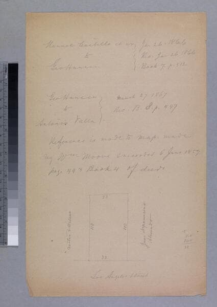 #1A: sketch on O'Melveny & Trantum stationery [from O.O. Trantum] showing lot with water ditches & S.P. railroad, structure, distances, markers; #1B: very rough sketch on verso; additional sketch on sheet with courses & calculations, showing River, Chavis and other parcel owners [not scanned]. Title supplied by cataloger.