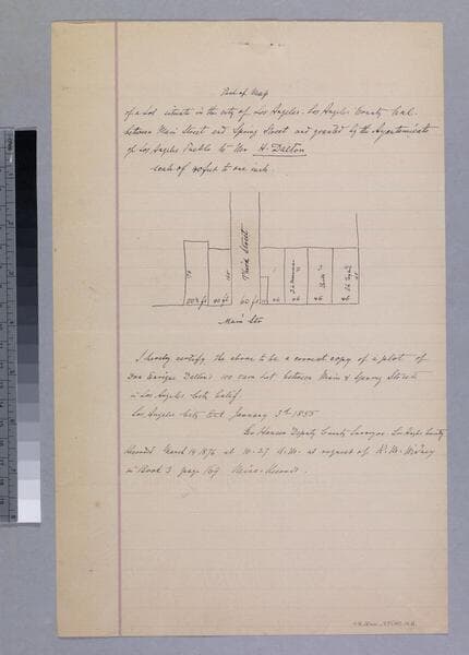 Second page of pinned document, "Part of Map of a lot situate... between Main and Spring Street..." showing parcels at Main & Third streets, showing boundary distances there is a 15 x 8 1/4 sketch on tracing paper labeled, "Dalton;" a 10 1/8 x 7 7/8 sheet with sketch of parcels at Spring & 3rd streets, reference map by Hansen from 1855. Title supplied by cataloger.