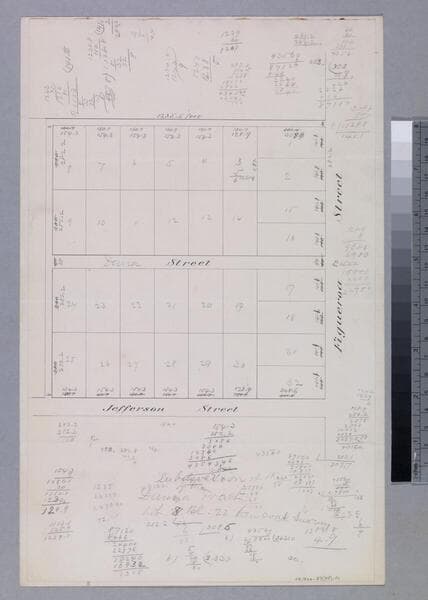 Northwest corner of Jefferson & Main St., with part of sec. 8, T.2S. R.13W. S.B.M., straddling Patent Boundary line. Notation: "Orangery of Wm. B. Lawlor, Lot 7 Bl 2 Hancock's survey. Pencil annotations & calculations. [see also Map 490: Briswalter Survey of January 26, 1880]. Alt title supplied by cataloger.