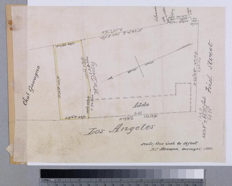 #2A: p. 2 of attached document, "Arcadia B. de Baker..." featuring parcel south of Morgan Lane along Los Angeles street with courses, distances; #2B: second sketch is on front page of fastened document, "Stearns. Field Notes..." showing Main Street, parcel owners, stations, courses, distances. Title supplied by cataloger.