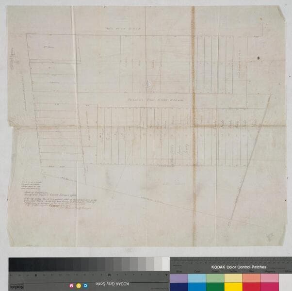 Showing color highlighted lots of Ramirez, Rimpau, Keller and numerous numbered lots facing Aliso Street at Alameda; structures, courses, distances. Alt. title supplied by cataloger.