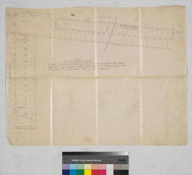 Showing color highlighted lots of Ramirez, Rimpau, Keller and numerous numbered lots facing Aliso Street at Alameda; structures, courses, distances. Alt. title supplied by cataloger.