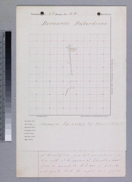On printed township grid showing structures, surface detail, notes re: parcel owners & corresponding courses. Paper watermark: Hurlbut Paper Co. Title supplied by cataloger.