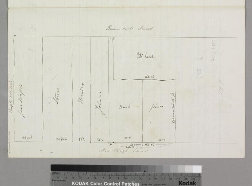 Pgs. 12-15 of document, "Survey of Subdivision of the Eaton Lots..." showing parcel owners along New High St. & Buena Vista; courses, distances. Title supplied by cataloger.